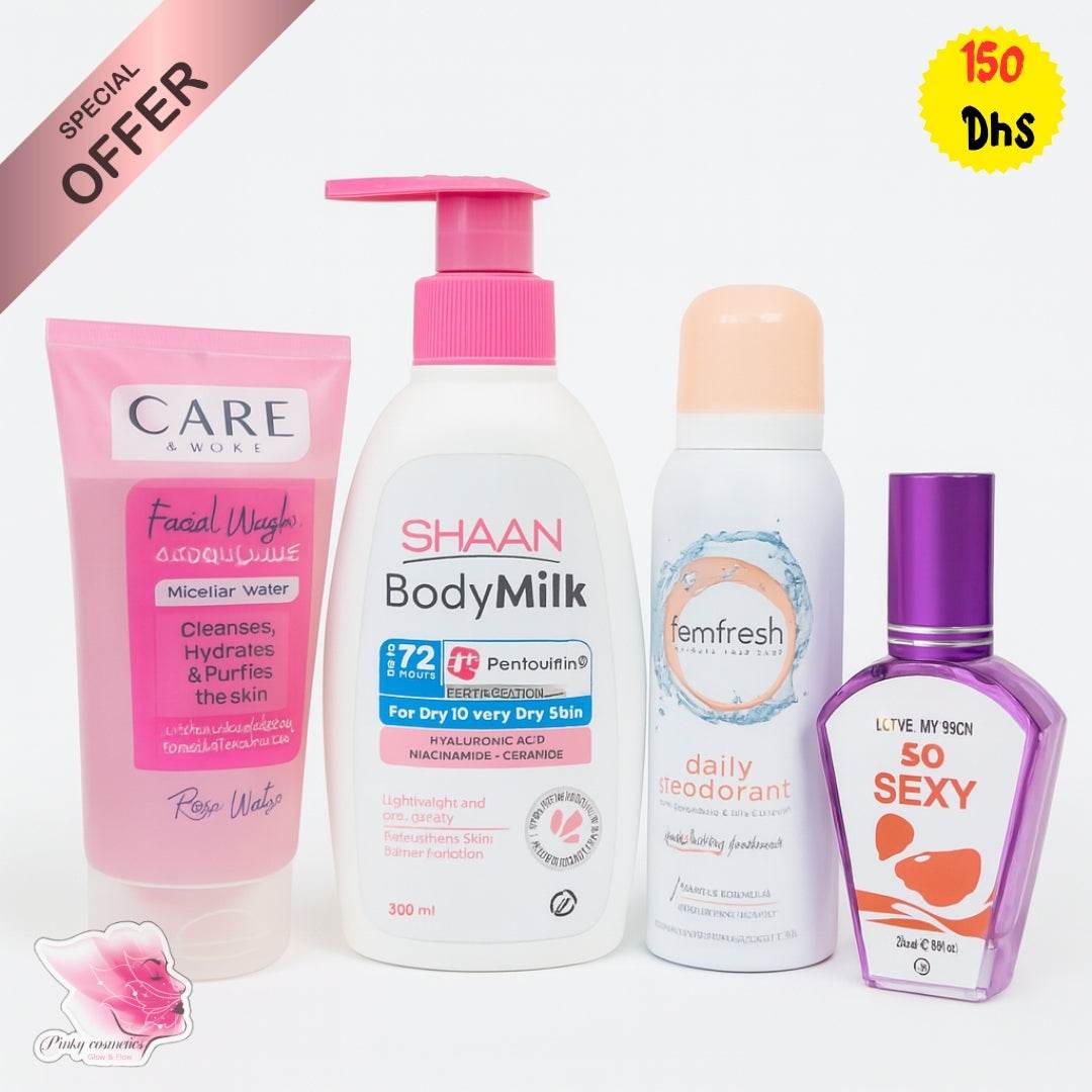 🌸اكتشفي بشرة ناعمة ورطبة وواثقة مع مجموعة العناية الأنثوية - مجموعة مثالية 4 في 1 للانتعاش اليومي والعناية الذاتية. 🌹