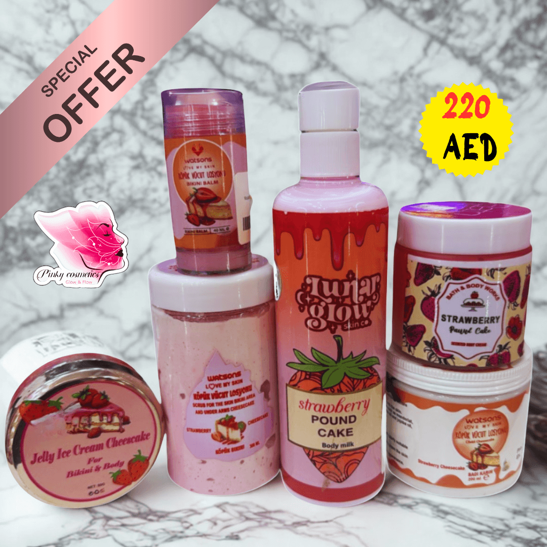 ✨دللي بشرتكِ برفاهية مجموعة العناية بالجسم بنكهة الفراولة - مجموعة فاخرة من 6 قطع مصممة لتغذية بشرتكِ وتنعيمها وتعطيرها برائحة تشيز كيك الفراولة. مثالية للعناية اليومية أو كهدية لذيذة لعشاق العناية بالبشرة.✨