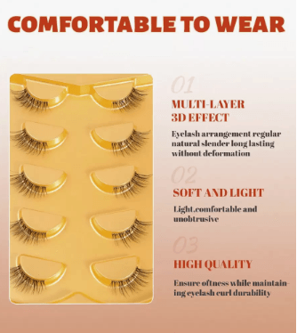 عززي إطلالتكِ مع هذه الرموش الاصطناعية الخمسة الخفيفة بتصميم عيون القطة، والمميزة بشريط شفاف لإطلالة طبيعية وانسيابية. مصنوعة من ألياف المنك الصناعي الناعمة، تمنحكِ هذه الرموش القصيرة كثافةً ووضوحًا دقيقين، مثالية للأناقة اليومية أو مكياج راقي. تصميمها خفيف الوزن يضمن لكِ راحةً طوال اليوم، مع إبراز جمال عينيكِ برشاقةٍ لا مثيل لها. مثالية لمن يبحثن عن رموش احترافية وبسيطة.