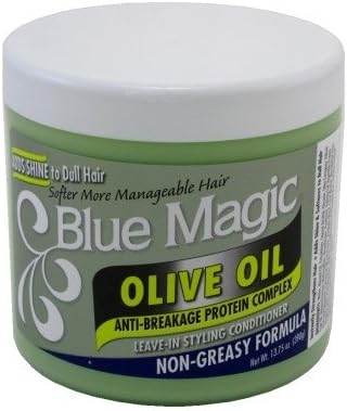 Blue Magic Olive Oil Leave-In Styling Conditioner is formulated with a powerful Anti-Breakage Protein Complex to help protect, strengthen, and revitalize your hair. Infused with the goodness of olive oil, this non-greasy formula adds shine to dull hair while deeply moisturizing and conditioning.